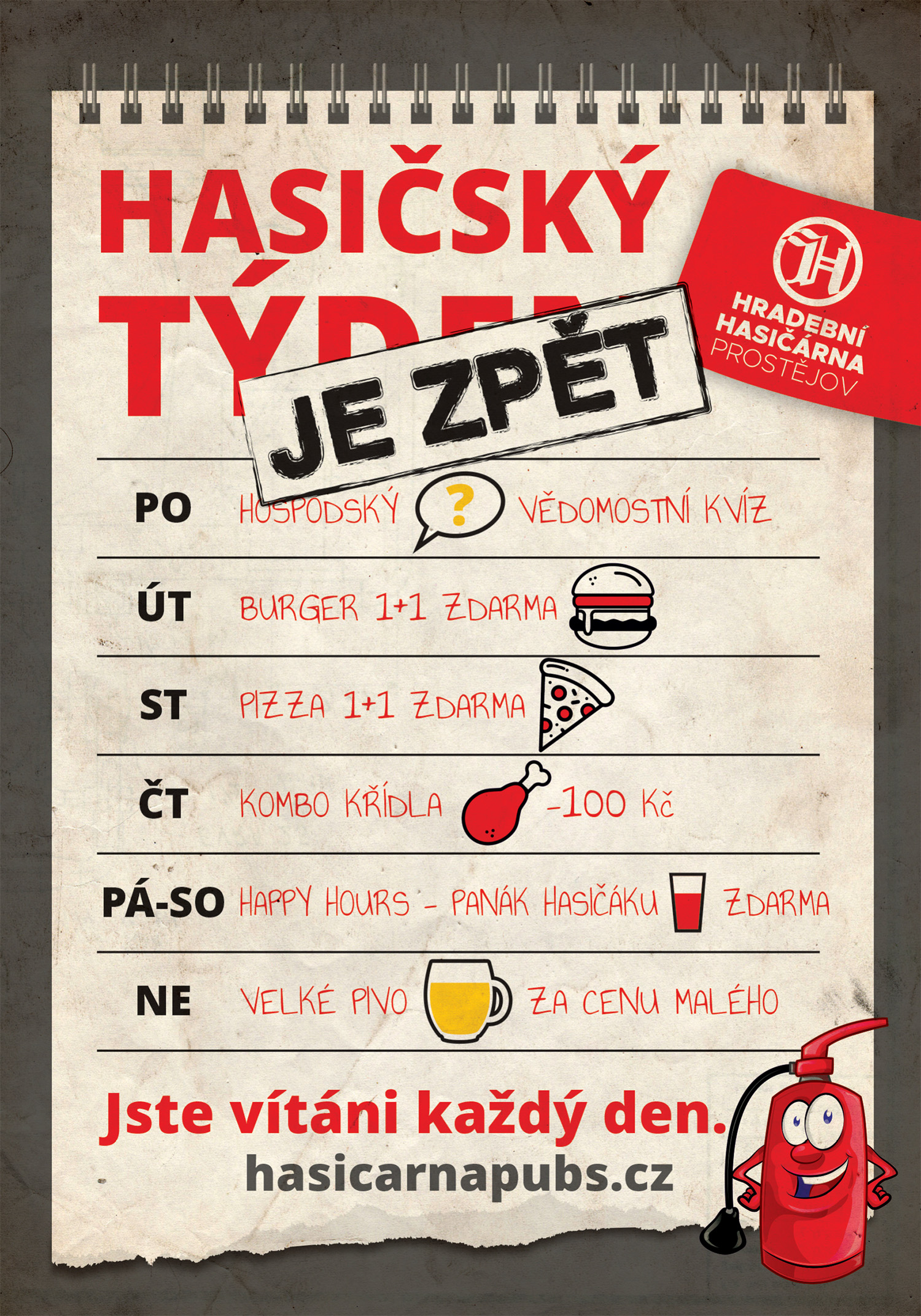 A proč se náš koncept jmenuje Hasičárna? Protože  hasíme Vaši žízeň každý den! Industriální a chlapský duch  hasičských zbrojnic umocní návštěvu vynikajícím jídlem, skvěle ošetřeným pivem spolu s ochotným a přátelským personálem. U nás jste vždy vítáni!
